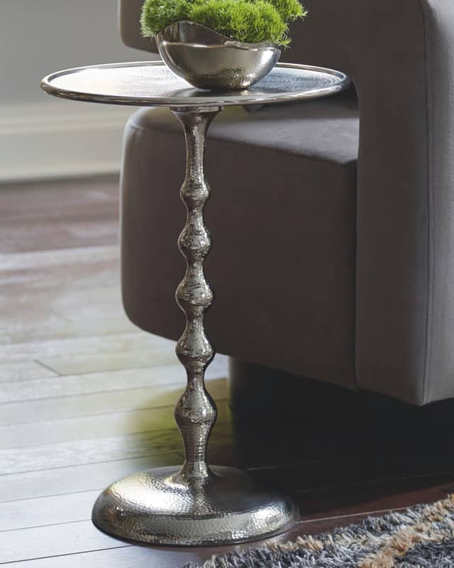 This accent table brings understated elegance to any space. The round side table has a classic shape that’s perfect next to a roll-arm sofa or sleek track-arm chair. It’s crafted entirely of metal and sealed with a lustrous plated silvertone finish with hammered pattern accent.