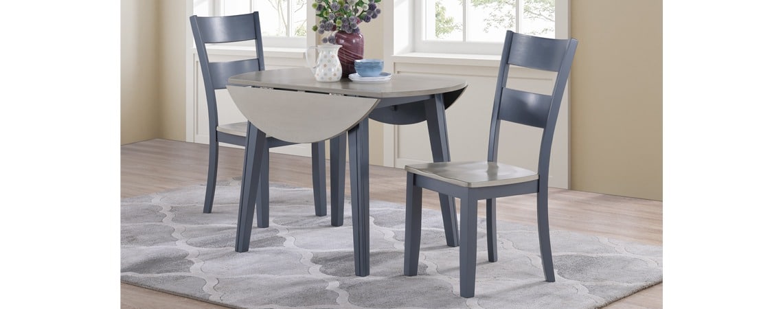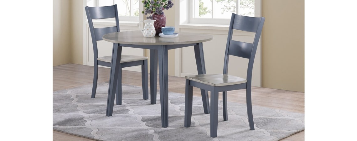 This two-tone gray and graphite coloration dining group features solid rubber wood and MDF. Chairs have solid hardwood frames with corner blocked legs and curved backs. Makes for a perfect space saver for any small space.