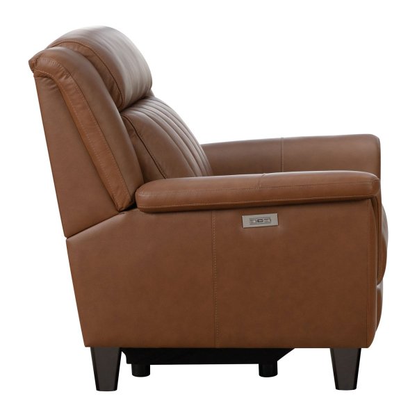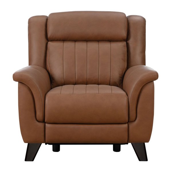 Mid-century modern elevated reclining sofa group. Featuring power recline pad over chaise channeled box seating, split channeled pub back with power head rest and tucked plush pillow arms. Outside arm power controller with USB port. Merlot finish wood legs.