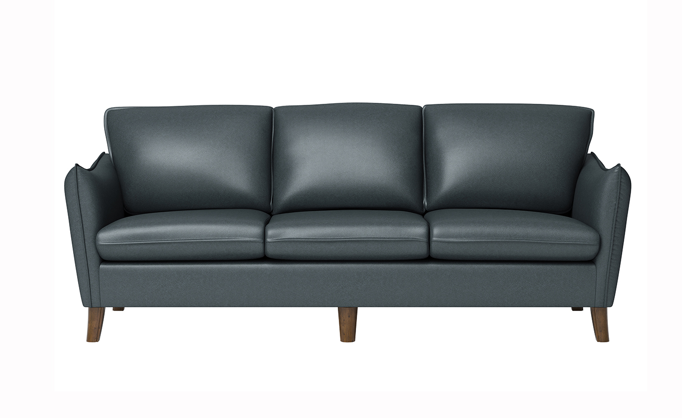Modern mid century sophistication featuring French seam details, handsome wooden legs in two leather look fabrics. Beautiful Navy Blue or Fawn Fabrics.