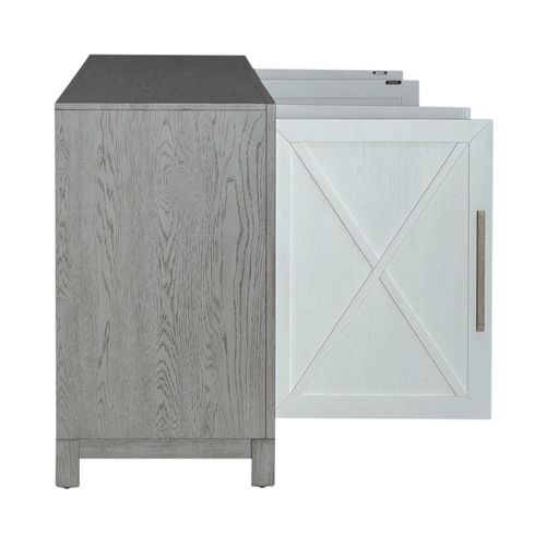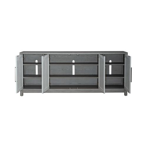 Home and perfection are achievable with the Palmetto Heights seventy-eight inch TV console. Crafted with excellence using rubberwood solids and split heart cathedral white oak veneers, this TV console features a two-tone Driftwood and Shell White finish. Whether you want to escape to the good life where every day is a vacation, or you want to bring a new level of casual sophistication to your home, Palmetto Heights offers a way to express your personality without sacrificing style. The seventy-eight inch TV console features picture frame molding with four wood framed doors with an X-pattern overlay that are accented with Pewter Wash bar pull hardware. The doors are supported by European soft close hinges. There are two large adjustable shelves behind the two center doors of the console, flanked by two smaller adjustable shelves on either side. Wire management provisions are added to help keep things looking neat and tidy. The block foot base adds a contemporary element to the clean lines of the TV console. The Palmetto Heights seventy-eight inch TV console offers a unique point of view that is sure to inspire.